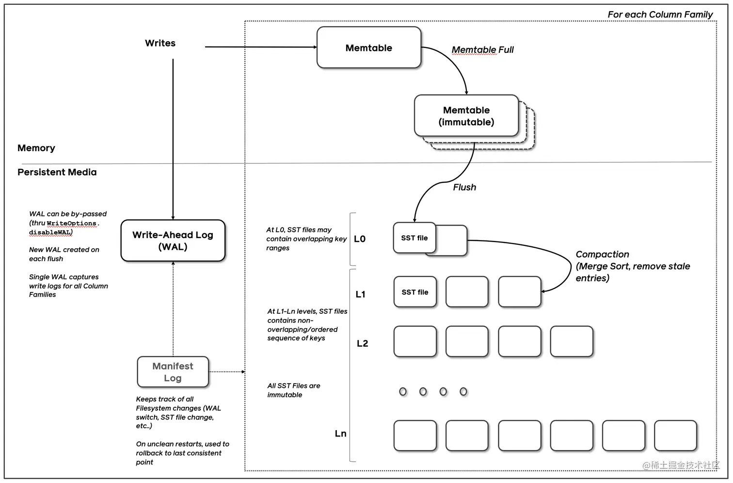 在RocksDB中每一次数据的更新都会涉及到两个结构,一个是内存中的memtable(后续会刷新到磁盘成为SST),第二个是WAL。