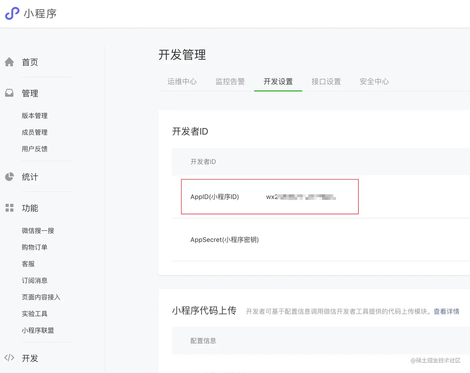 在小程序管理界面,开发管理,开发设置下获取 AppID: