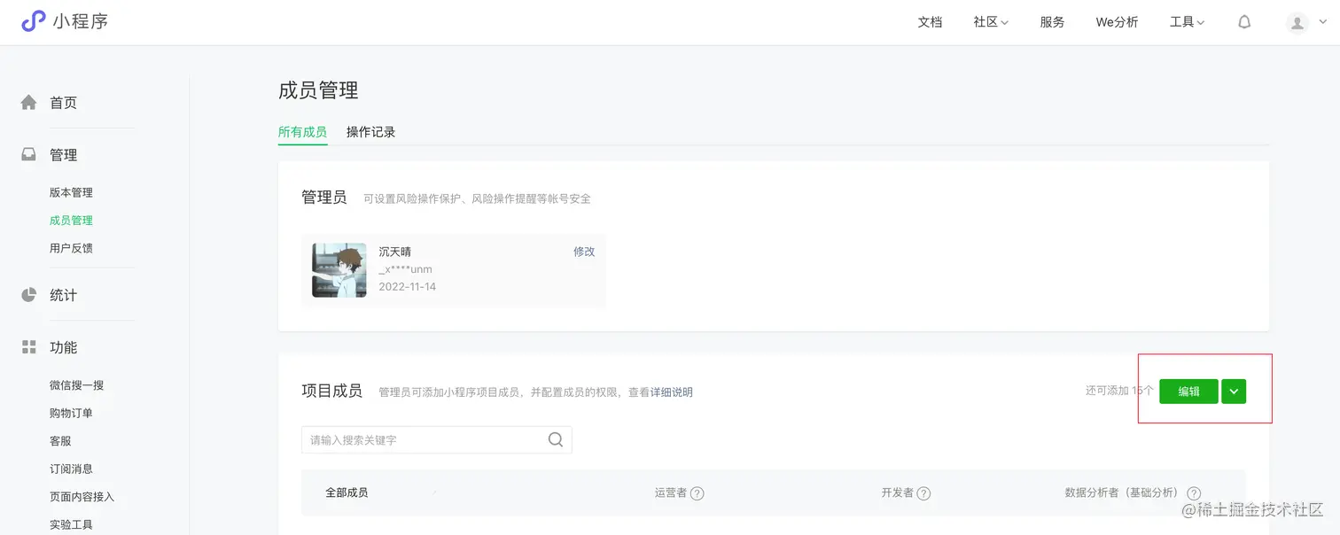 在小程序管理界面,成员管理,添加成员(管理员不需要再添加):