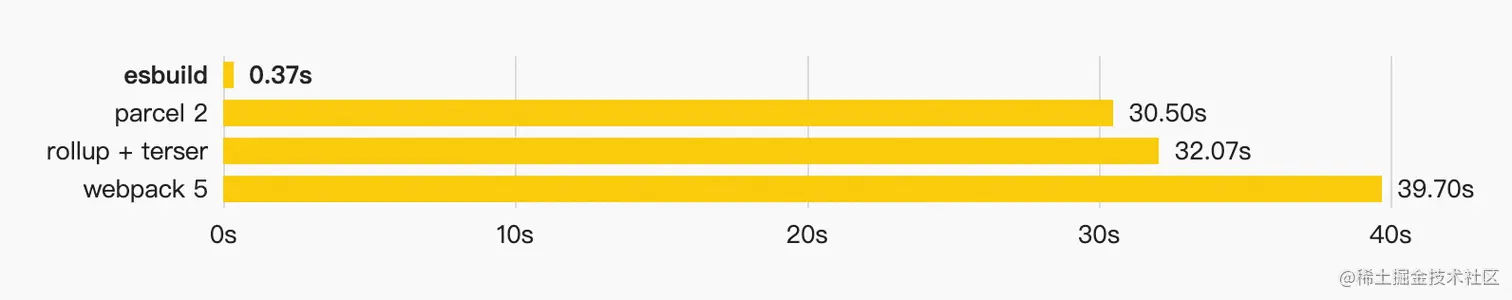 esbuild则选择了使用Go来编写,充分利用多线程 + 运行机器码,在语言上有性能优势,架构设计上充分利用多核CPU优势、高效利用内存,性能表现十分惊人