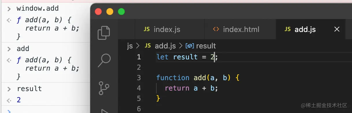 2015年ES6发布了,带来了官方的模块化规范ES Module,写法和CommonJS规范比较像(机制有差异,详见 es6.ruanyifeng.com/#docs/modul…),使用import导入,export导出,示例代码成了这样: