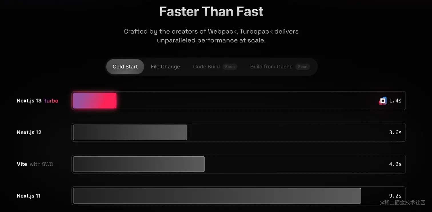 2022年10月,Vercel 发布了Turbopack,webpack作者亲自操刀,用Rust再写了一个webpack的后继者 - Turbopack,基于Rust的高度优化的机器代码、函数级别的内存增量计算引擎(执行过的函数,不会再次执行) ,实现了更快的速度...