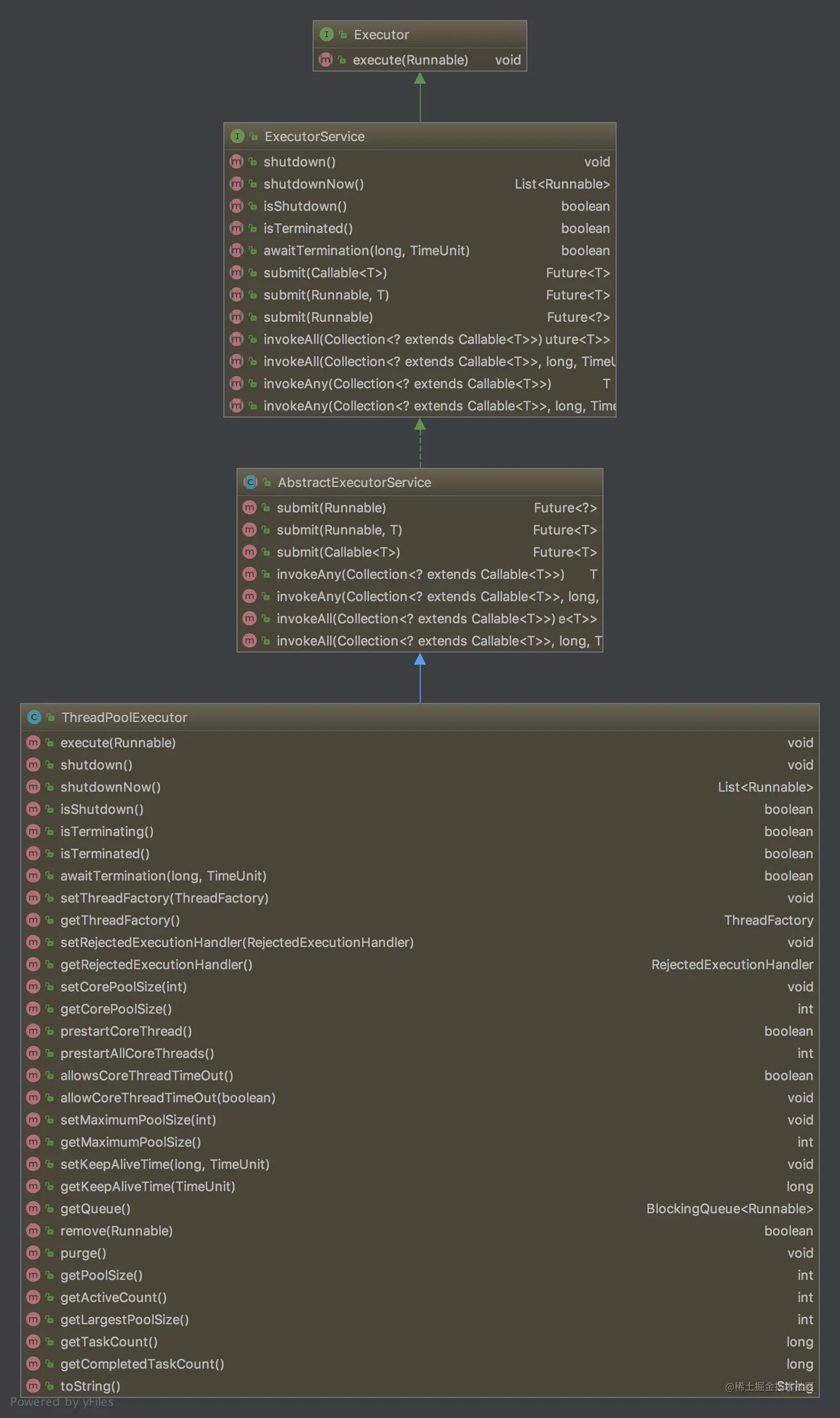 从上图中可以看出,Executor是置于最顶层的,也是最短最简单的一个接口,里面只有一个execute(Runnable runnable)方法,从名字上也可以看出,这是一个执行任务的方法。接着往下看到ExecutorService,它同样的也是一个接口,只不过在Executor接口的基础上定义了更多的接口方法,这些方法更加便利我们去管理线程池,一般来说我们都会使用这个接口。