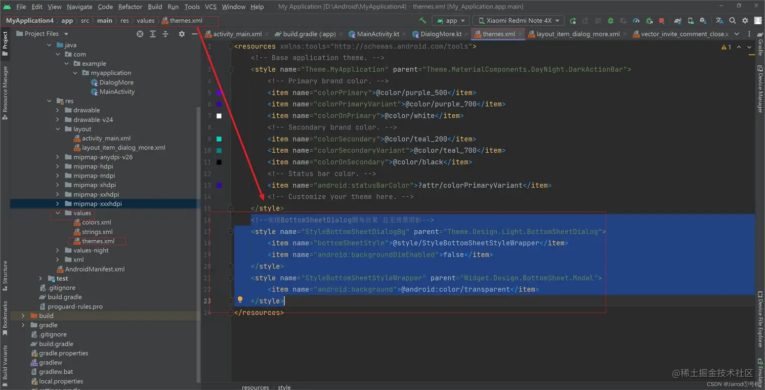 <!--实现BottomSheetDialog圆角效果 且无背景阴影-->