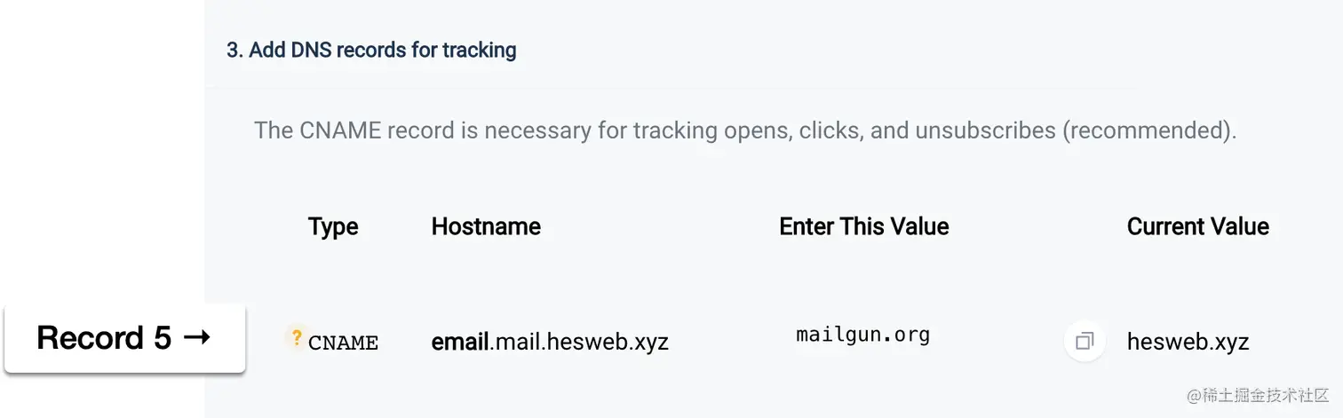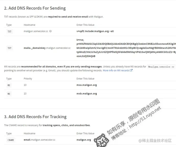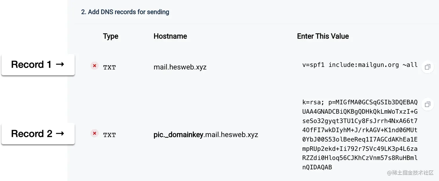 输入域名新增后,根据Mailgun会给出相应的域名指向教程并给出指向所需**(EnterThisValue)**