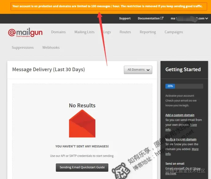 您的帐户正在试用期,域名限制为100封/小时。 如果您继续发送良好的流量,该限制将被删除。