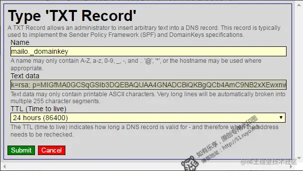 - 这里用的是 TXT 记录来实现的,不要搞错。虽然 cloudflare 支持这三种记录,但是国内的好多服务商不支持,所以除了 MX 记录,其他三个需要用 TXT 记录