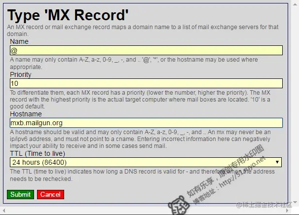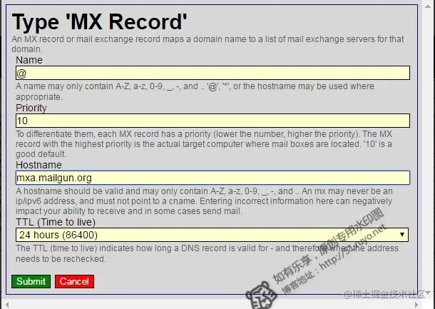 记录 3 和 4是特定于通过 MailGun接收电子邮件的 MX(邮件交换)记录(相对于以上两个特定于发送电子邮件的记录)。
