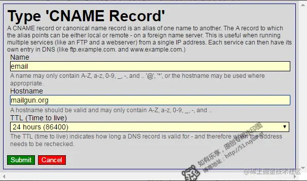 记录 5是CNAME(规范名称) 记录,用于创建从一个域到另一个域的别名。在这种情况下,您将在您的域 ( ) 的子域email.mail.yourdomain.com和 MailGun 的域 ( mailgun.org) 之间创建一个别名。