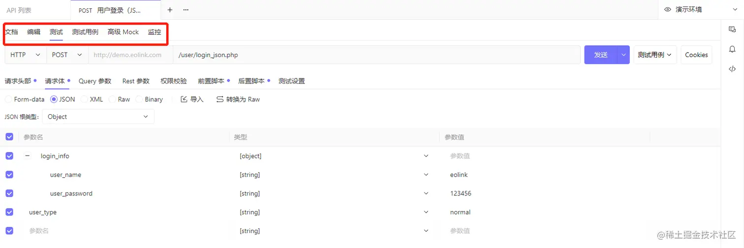 进入 API 文档详情页,点击上方 测试 标签,进入 API 测试页,系统会根据API文档自动生成测试界面并且填充测试数据。