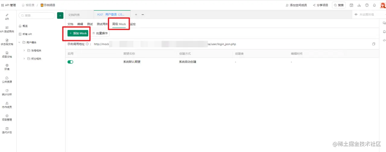 1、进入API文档详情页面,点击 "高级Mock" 标签,点击"添加 Mock ”。