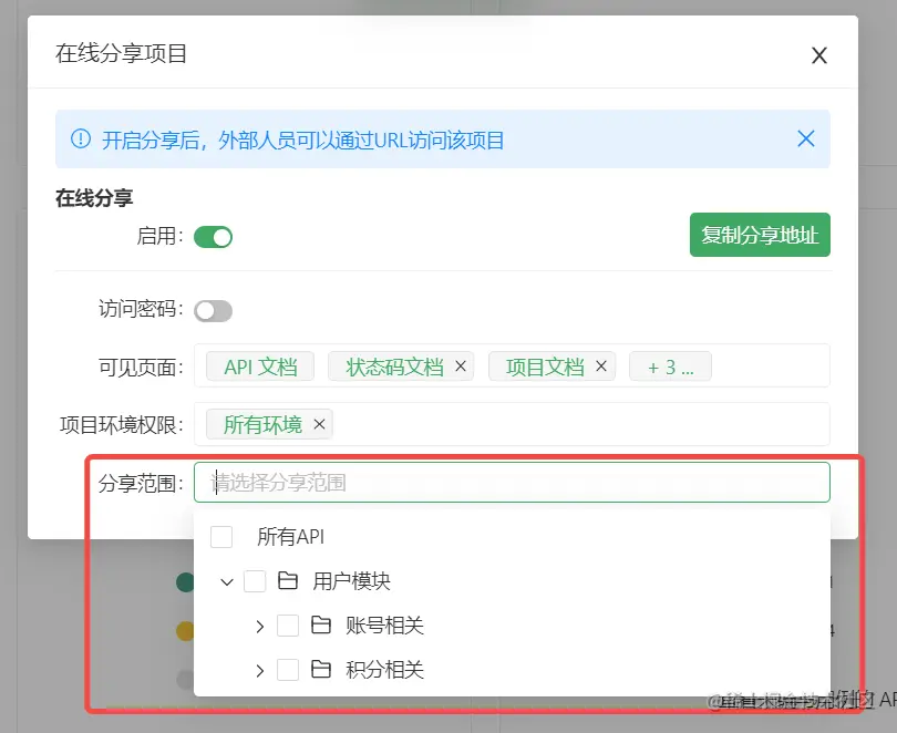 可设置分享范围,用于控制外部人员可查看的API文档范围,系统默认可查看项目内所有API。用户可进行逐一勾选。系统默认分享所有API