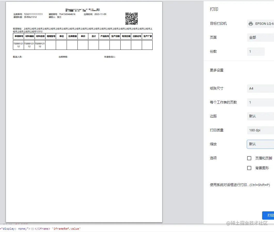 说明:这里需要说明一下,我这里的都是没有通过人工手动去调整的比例以及边距,考虑到用户可能不止打印我们这一个条码或者单据,如果修改了默认的打印样式或导致其他条件下也会生效,或造成非常不好的体验这些都可以通过@media 设置打印的样式,可以通过size属性来设置纸张大小以及区域大小,具体根据开发的情况自己调试,调试比较费时间,所以可以直接拿我这个去调试