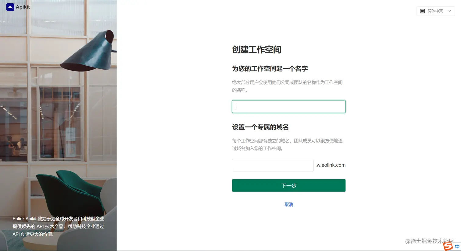 点击创建/加入,在引导页面中选择创建工作空间,填写工作空间名称、域名并点击确定即可。