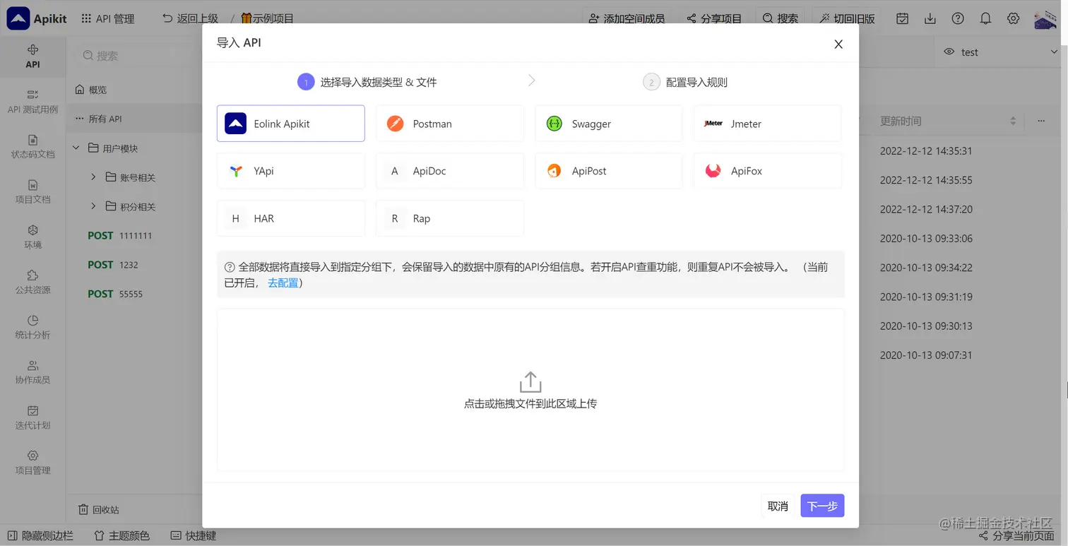 说到这里,如果真的要使用ApiKit,肯定会考虑到我们的业务已经迭代了这么久了,存在大量的接口,重新用ApiKit去一个个定义好接口文档,肯定不太现实吧?别担心,由于 ApiKit 支持 OpenApi、Postman,Jmeter 等数据格式导入,所以旧项目可以一键无痛迁移到Apikit,无需再次新建项目。