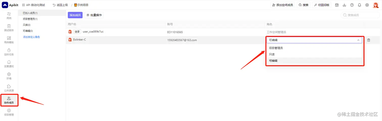 在团队协作这方面,ApiKit 拥有成熟的 团队权限 和 项目权限 管理,支持管理员、普通成员、只读成员等角色设置,满足各类企业的需求。团队权限指成员对团队操作的权限,项目权限指成员对项目操作的权限。