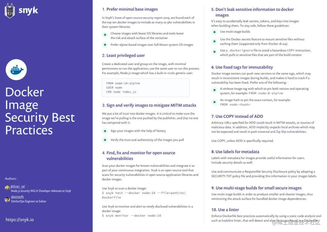 《Docker 镜像安全最佳实践速查表[1]》列举了 10 个诀窍和指南,确保更安全和更高质量的 Docker 镜像处理。此外,还可以检视有关 Docker 安全的新报告《Docker 安全要趁早[2]》。