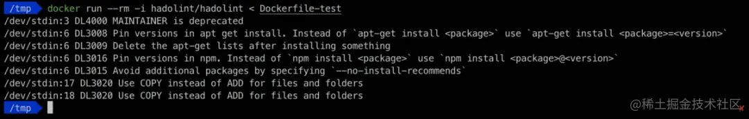 例如,hadolint 分析 Dockerfile 并列出不符合最佳实践规则的地方。
