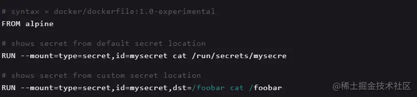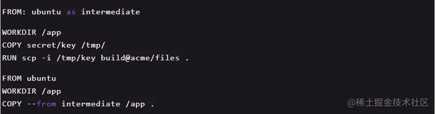 利用 Docker 的多阶段构建功能,用一个中间镜像层获取和管理机密信息,然后清除中间镜像,这样在应用镜像构建阶段不涉及敏感数据。如下面例子所示,使用代码将机密信息添加到中间层: