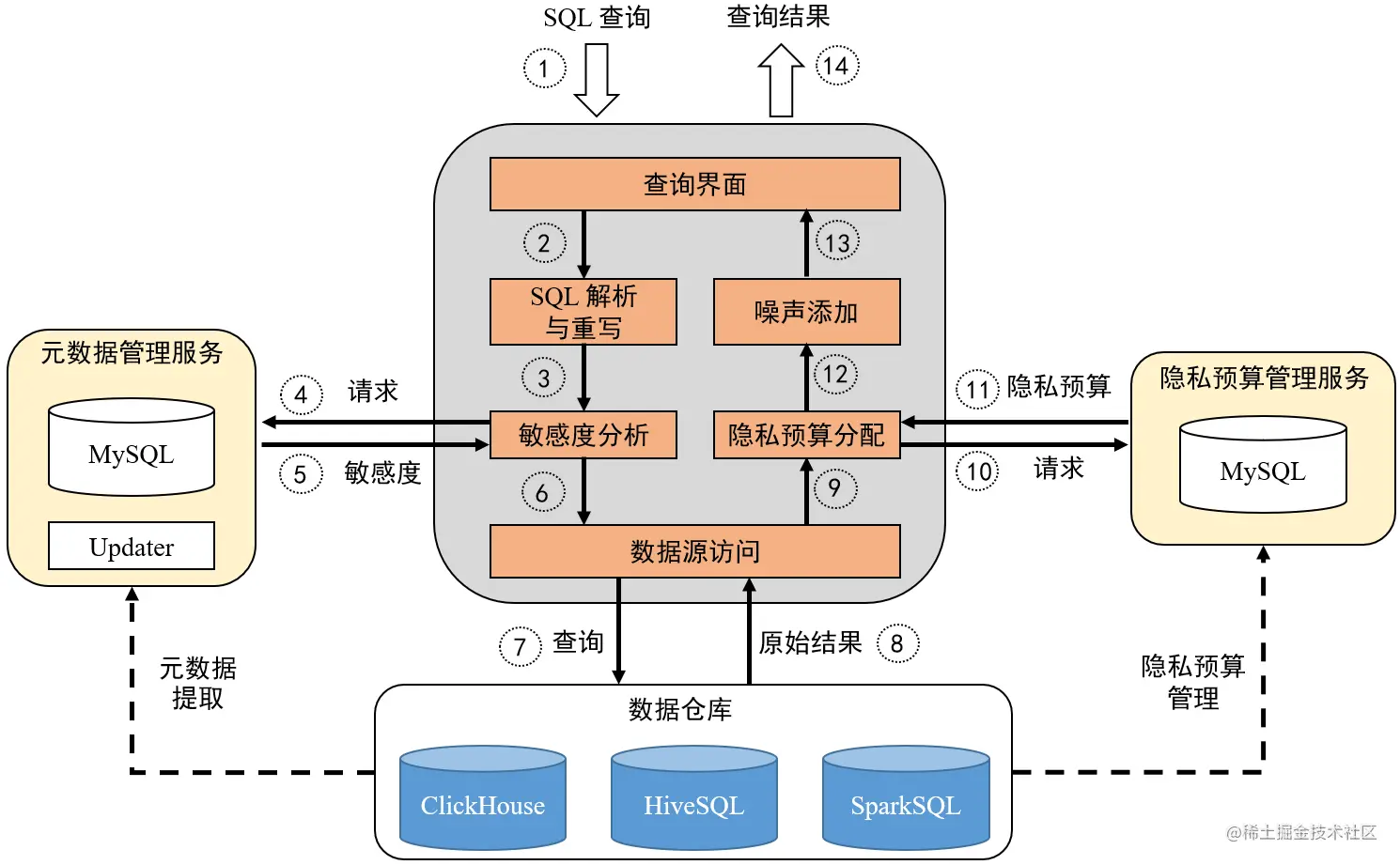 - 首先,核心服务接受客户提交的SQL查询语句,对该语句进行解析和重写,以便于计算隐私噪声(如将AVG计算改为SUM/COUNT);