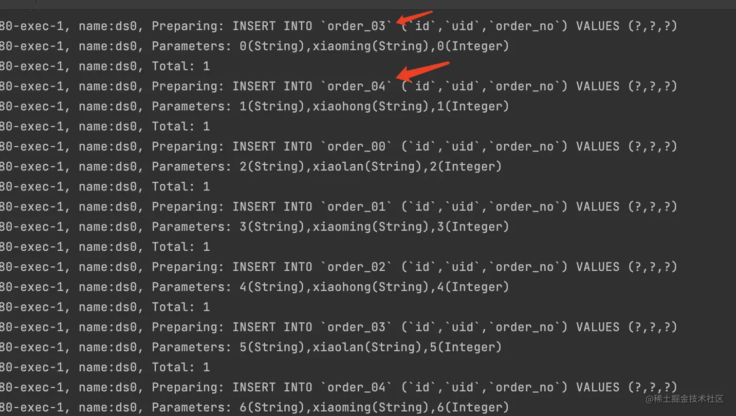 ==> SHARDING_EXECUTOR_10, name:ds0, Preparing: SELECT t.`id`,t.`uid`,t.`order_no` FROM `order_04` t ORDER BY t.`order_no` ASC LIMIT 20