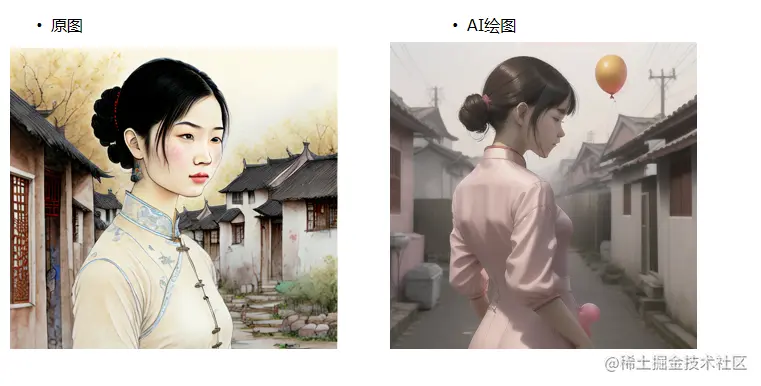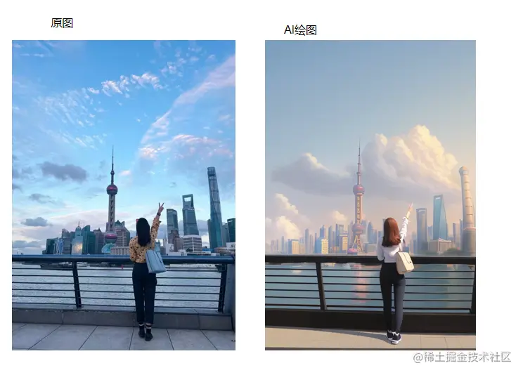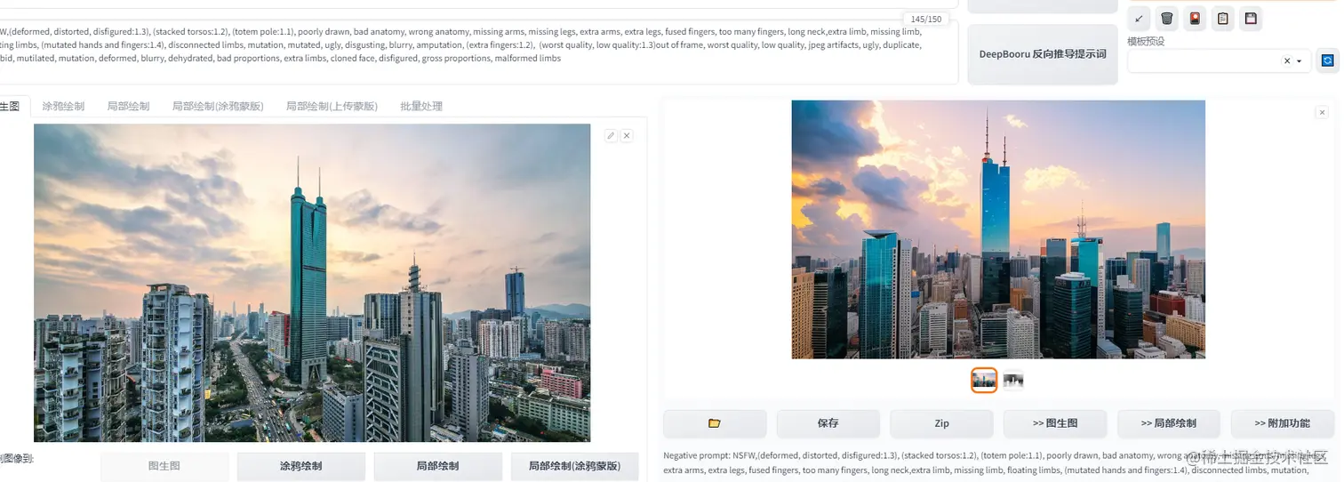 我重绘幅度调的0.75,建筑已经比较接近原图了,用图生图的功能时,重绘幅度越大,AI发挥空间越大。一般0.6-0.75左右会比较接近原图。但是人物衣服的颜色也差距较大。