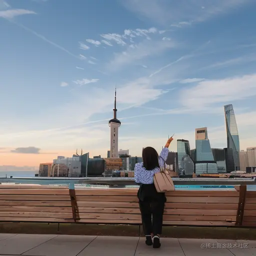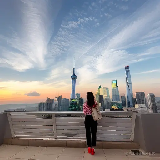 提示词:((masterpiece)),((nsanely detailed)), ((HD Quality)),((best quality))((Illustration style)), the back of a girl, the background is the scenery near Oriental Pearl TV Tower in Shanghai
