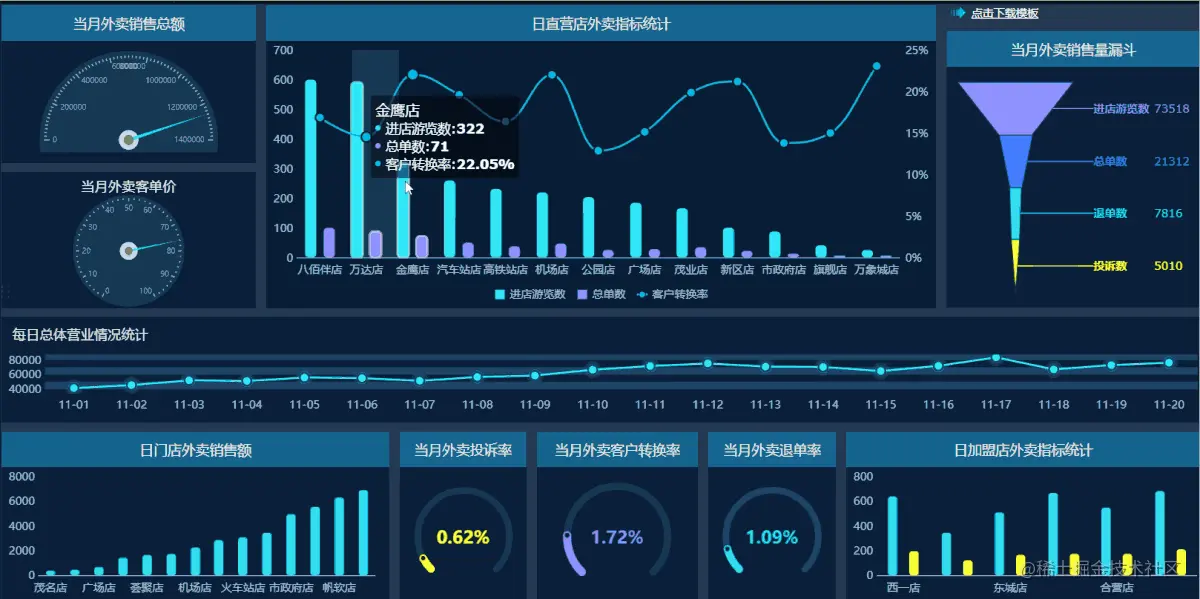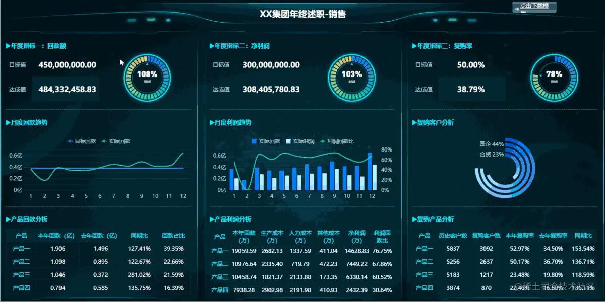 现在很多企业都有周报、月报、季报...相当于长则一个月,短至一周,都会被要求以汇报的形式对工作内容进行总结和展示。有些小伙伴们对此不以为然,他们认为只要业绩到位,放几张精修图片,找个“精美”PPT模板敲几个字,最多用excel做个表,就坐等升职加薪...结果,反而挨了一顿骂,果然,在这个处处大屏时代,之前那些“精美大屏”早就无济于事了,还得是甩PPT几条街的酷炫可视化模板!