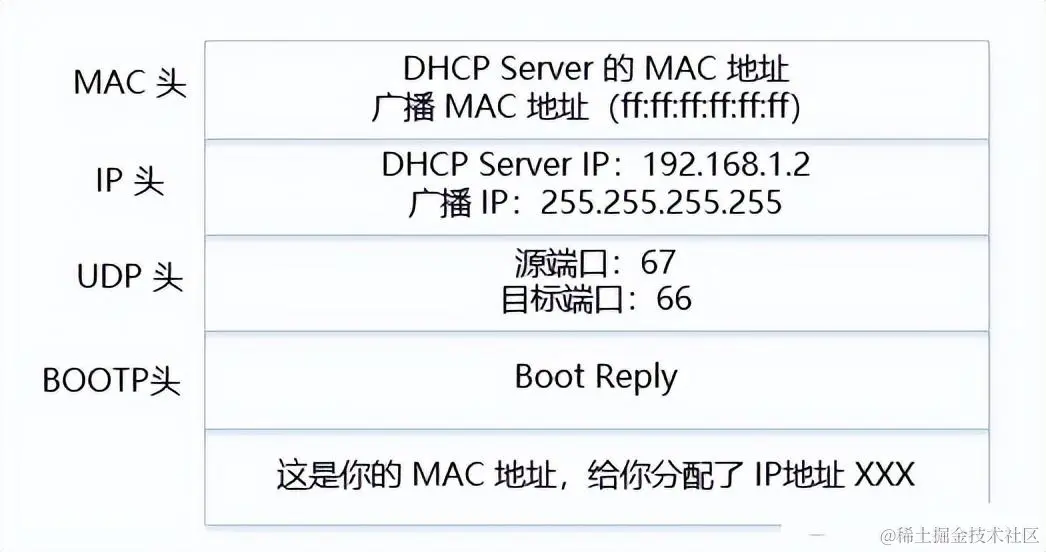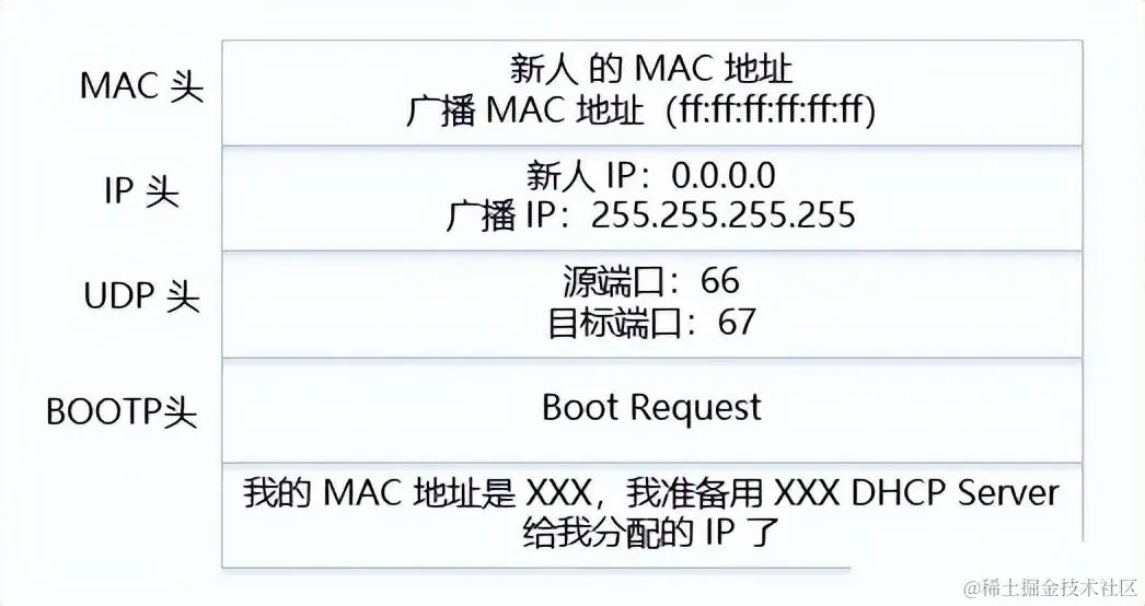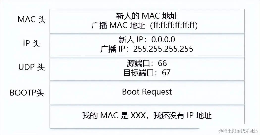 新来的机器使用 IP 地址 0.0.0.0 发送了一个广播包,目的 IP 地址是 255.255.255.255。广播包封装在 UDP 里面,UDP 封装在 BOOTP 里面。在这个广播包里,新人大喊:我是新来的(Boot Request),我的 MAC 地址是 xxx,我还没有 IP,谁能给我个 IP 地址?格式就像下面这样: