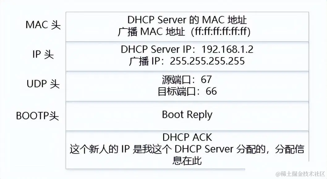 当 DHCP Server 接收到新机器的 DHCP Request 之后,会广播返回给新机器一个 DHCP ACK 消息包,表明已经接受新机器的选择,并将这一 IP 地址分配信息和其他配置信息都放入该广播包,发给新机器。DHCP ACK 格式如下: