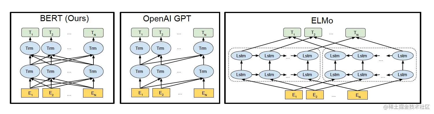 BERT使用的是双向的Transformer,OpenAI GPT使用的是从左到右的Transformer。ELMo使用的是单独的从左到右和从右到左的LSTM拼接而成的特征。其中只有BERT在所有的层考虑了左右上下文。除此之外,BERT和OpenAI GPT是微调(fine-tuning)的方法,而ELMo是一个基于特征的方法。