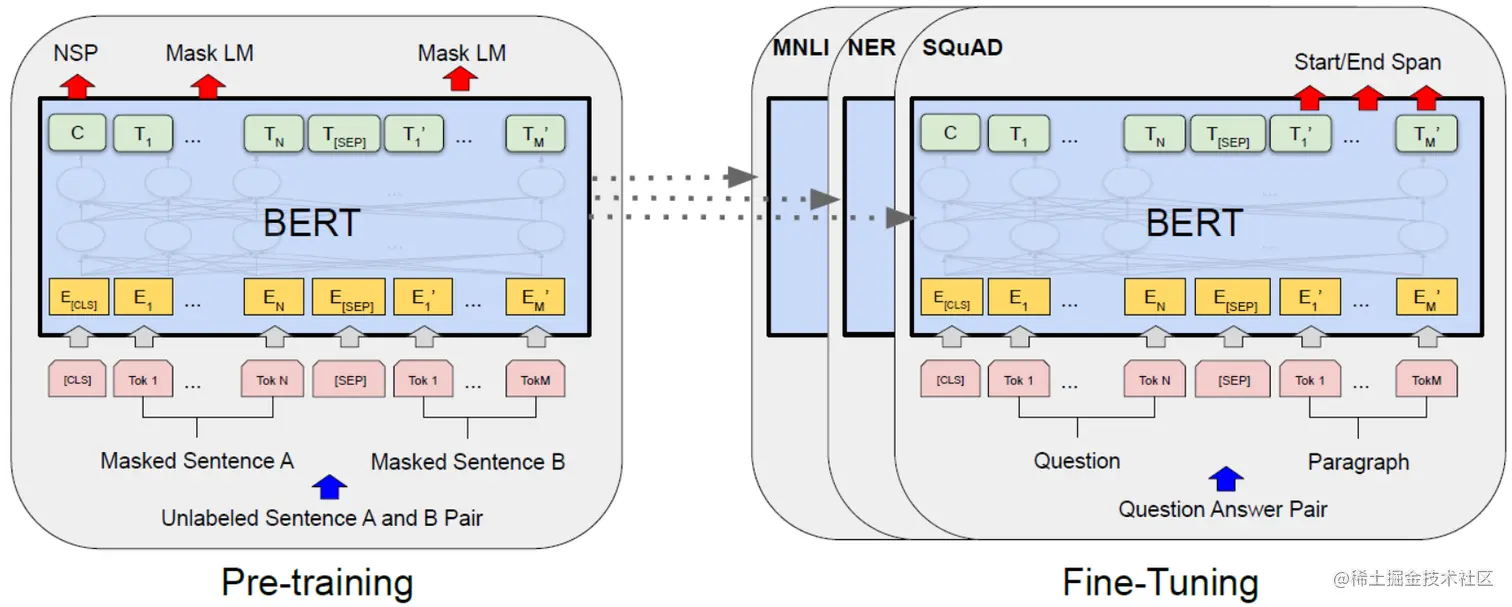 BERT是一个多任务模型,它的预训练(Pre-training)任务是由两个自监督任务组成,即MLM和NSP,如 图2 所示。