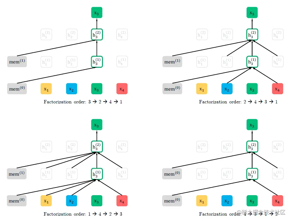 图1中和代表前一个的segment的缓存信息,另外,输入的序列顺序都是固定的自然语序,position embedding还是按照正常的顺序确定的。只是不同的排列中,参与分解计算的内容不同。具体来讲,对第一个分解次序,因为位于最前边,所以在这个分解次序中看不到其他的token内容,只能看到前一个segment的缓存信息;对第一个分解次序,前边有和,所以在计算位置输出的时候使用了和。