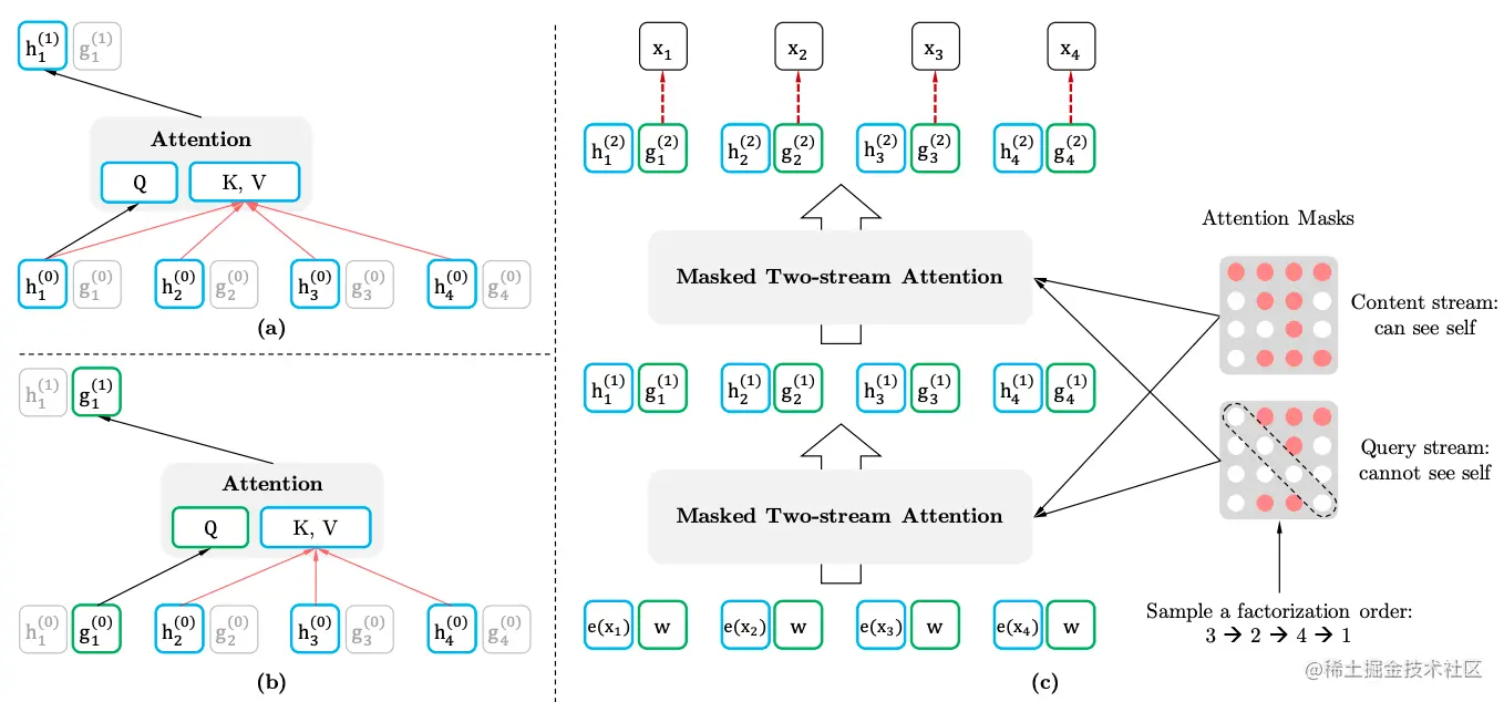 图2b展示了query-stream的自注意力计算,其中由可学习的参数进行初始化,因为它能看见token 3,2,4的内容信息,所以这里用的是内容信息,同时对于第1个位置,只能使用位置信息,而不能使用内容信息,所以这里使用的是,它并不包含第1个位置的内容信息。 这样就能比较好地建模。