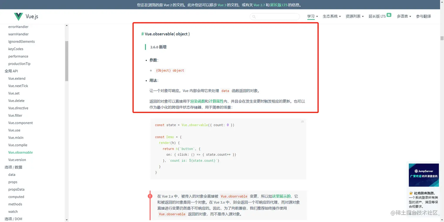 vue2.6 新增了一个api Vue.observable(object),用于将一个对象变成响应式对象