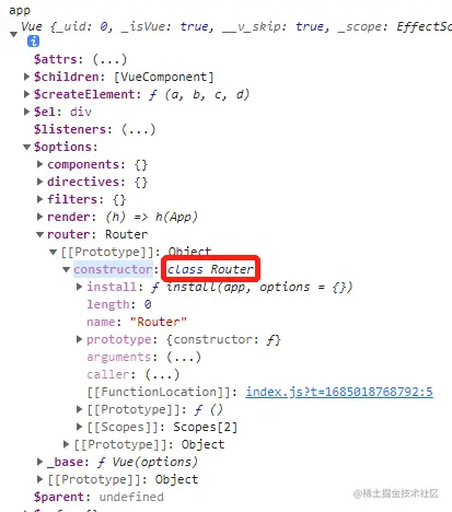还有其它的就不贴图了,发现了什么东西,app实例的$options才有router这个对象,这个对象就是Router的实例,其它组件是没有的!这个非常关键!通过这个特性可以将router挂载在原型上,因为所有组件都可以访问到原型上的属性