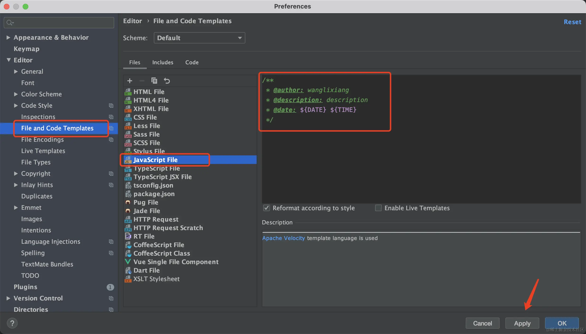 IDEA新建文件备注 wanglixiang 2023-05-26 140 阅读1分钟 在使用IDEA新建文件的时候,有时候需要在文件顶部添加备注,方便后续自己和团队成员对文件和代码功能的理解。如何在IDEA新建文件的时候,添加备注呢?方法如下: 步骤一:打开IDEA的设置窗口 步骤二:找到Editor->File and Code Templates->Files->Javascript Files,把对应的注释内容放进去,点击【Apply】 步骤三:新建JS文件的时候,即可生成带有预先编辑好模版内容的JS文件