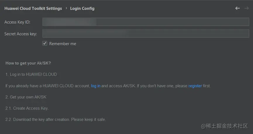 方式3:在 File -> Settings 里面找到 Huawei Cloud Toolkit Settings,点击 log in 快速进入到华为云控制台。