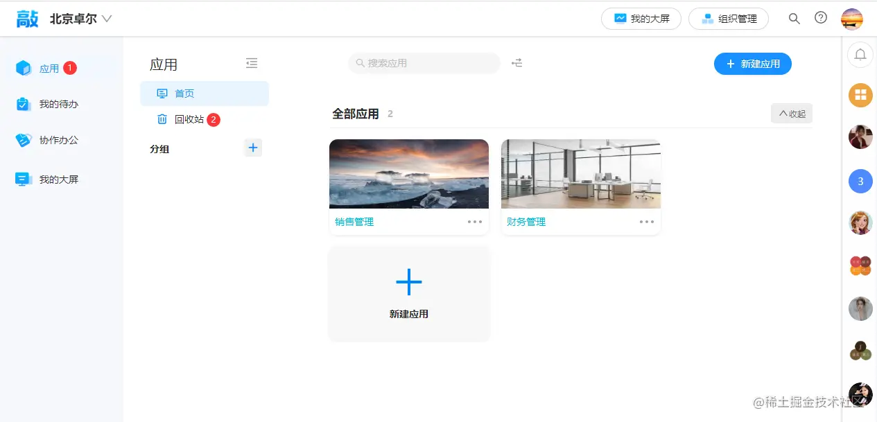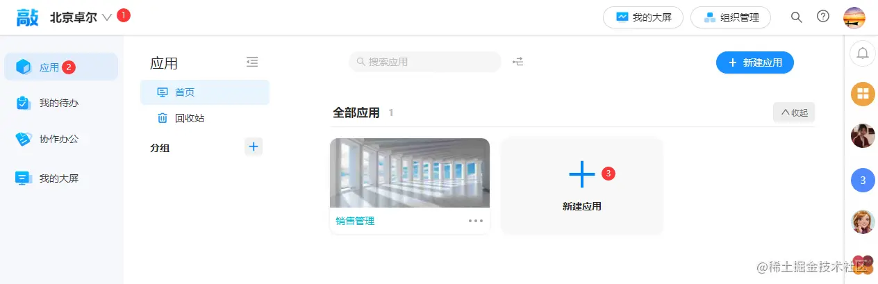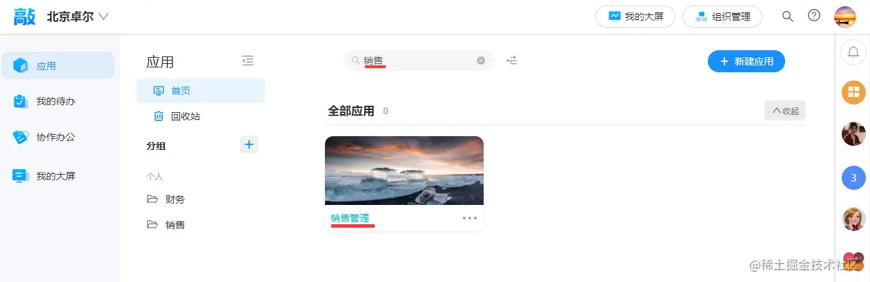 第一种方式:选择需要新建应用的组织,点击左侧的应用,然后点击新建应用