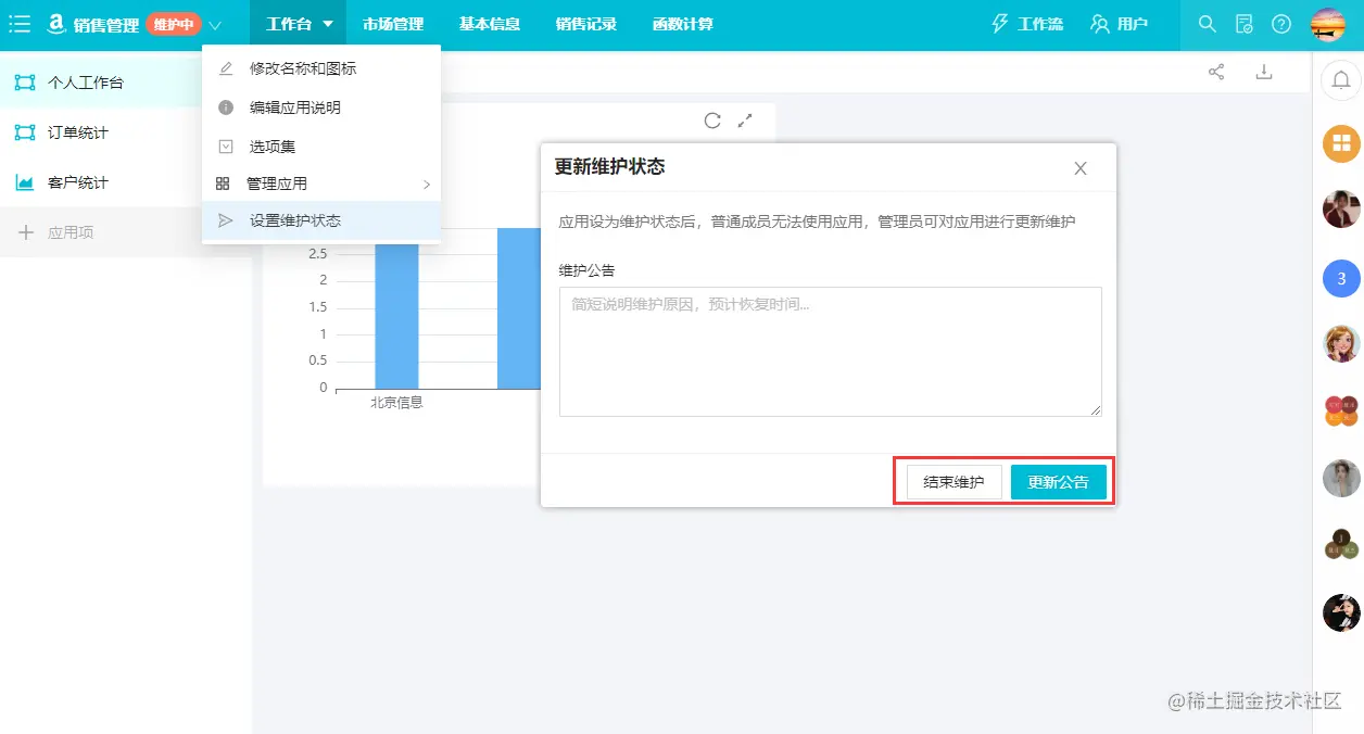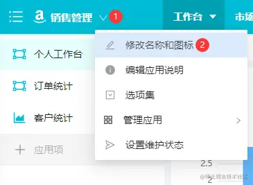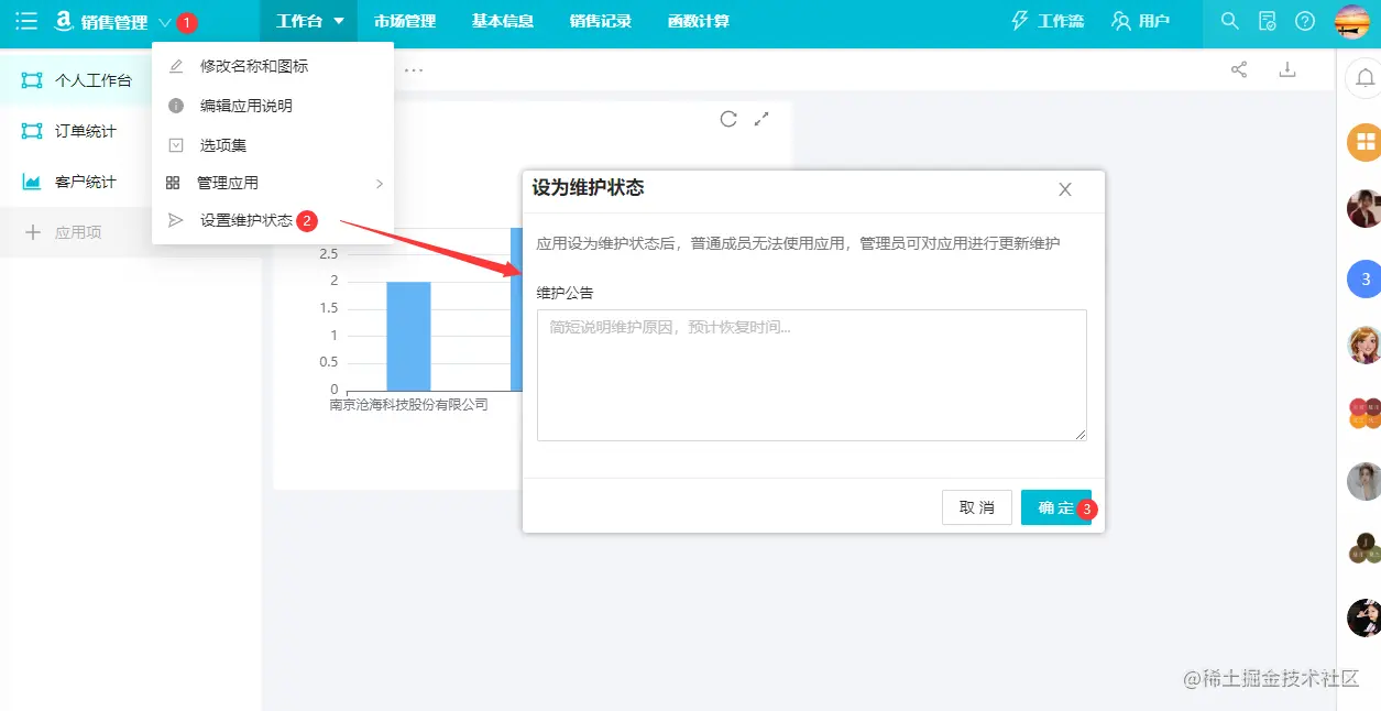 进入应用后,点击向下的三角(①),在下拉菜单中点击设置维护状态(②),出现弹窗,填写维护公告,点击确定按钮完成对该应用的维护操作