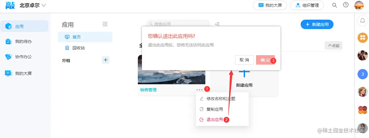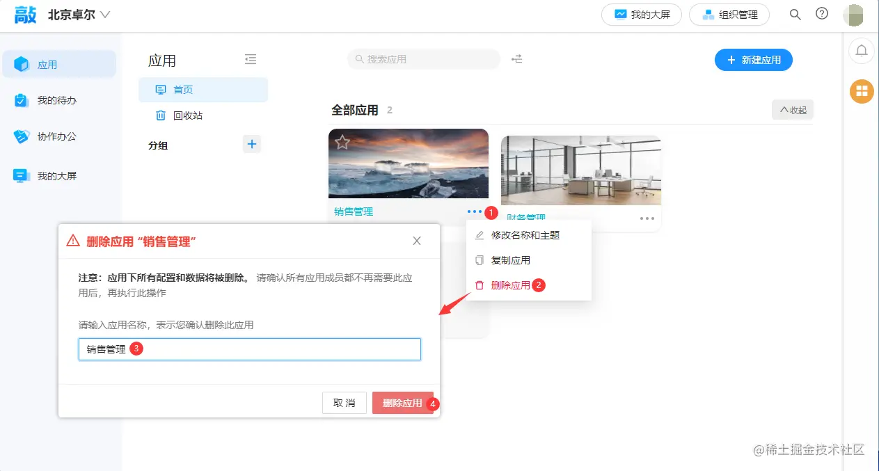 ...,鼠标移动在下拉菜单中点击删除应用,会出现删除应用的弹窗,在输入完成应用名称后,点击删除应用即可完成应用的删除应用下所有配置和数据将被删除。 请确认所有应用成员都不再需要此应用后,再执行此操作