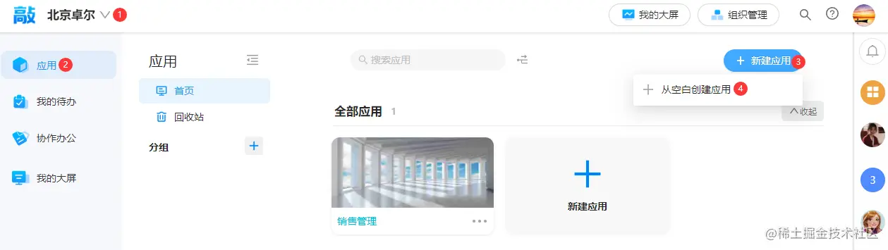 第二种方式:选择需要新建应用的组织,点击左侧的应用,然后点击新建应用按钮,在下拉菜单中点击从空白创建应用