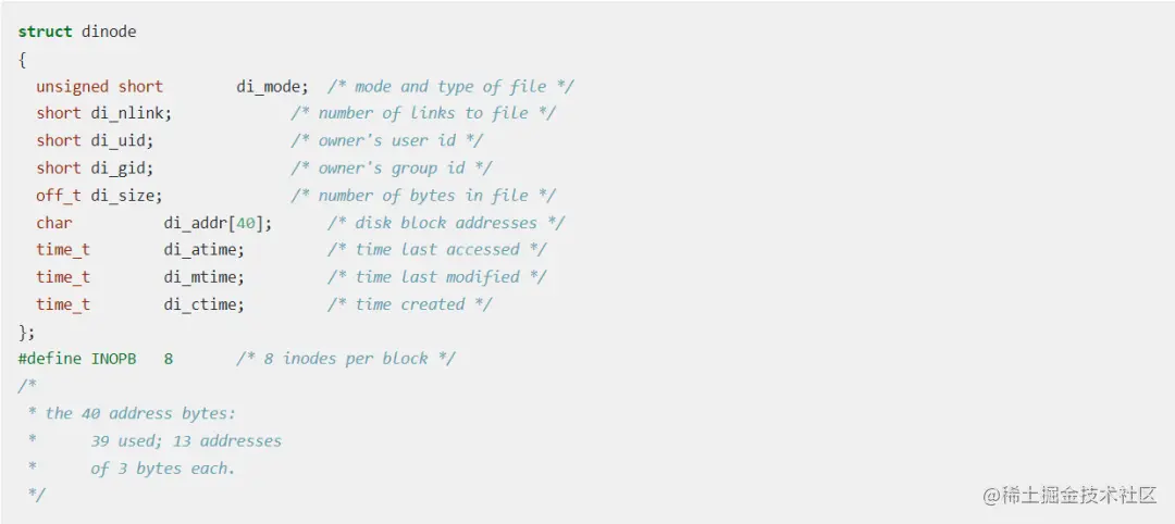 - (40字节)addr 数组,包含了文件的数据块在磁盘上的地址;