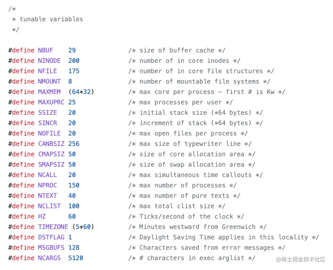 在 Unix 中,我们通过配置头文件(header file)来处理系统资源。如下图所示,这里显示了头文件中配置的默认值,数据结构是数组,所示值是相应的数组大小。如果要更改它们,则需要编辑文件,重新编译和链接内核,然后重新启动系统。