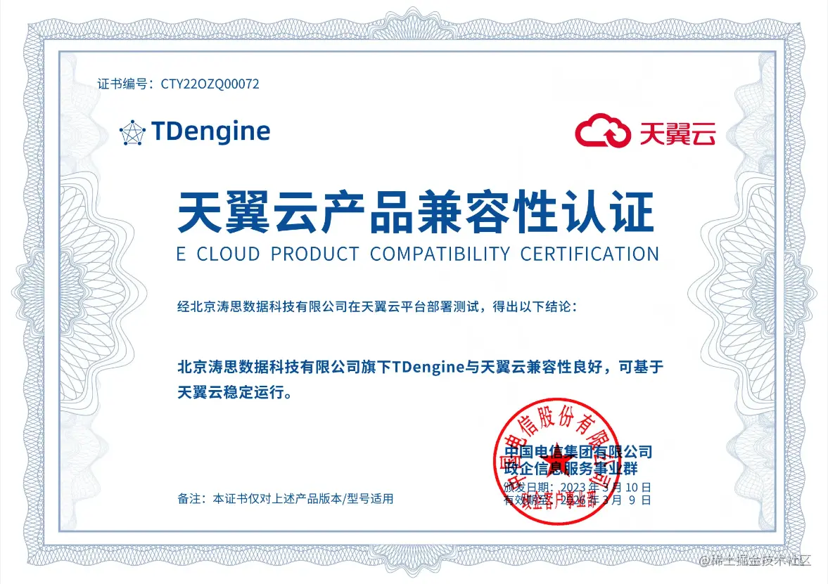 从上述背景出发,北京涛思数据科技有限公司与天翼云科技有限公司于近日完成产品兼容性适配互认证。本次测试是由涛思数据旗下时序数据库 TDengine 与天翼云平台进行适配认证,结果显示,双方产品相互良好兼容,系统功能运行稳定,产品体验良好,满足了用户功能、性能和可靠性要求。双方将在国家信创产业的背景下,为推动行业良性发展,加速数字化转型提供安全保障。