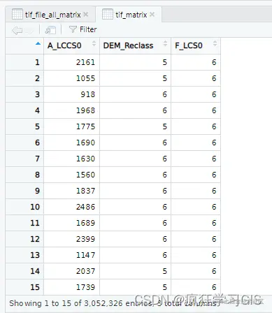 运行上述代码,将在RStudio的左上方看到变量tif_file_all_matrix的数据情况,如下图所示。可以看到,此时tif_file_all_matrix变量是一个3列、6377265行的矩阵(Matrix)数据;其中,每一列表示每一个图层的数据,每一行则是每一个图层在同一空间位置上各自像元的数值。此外,每一列的名称即为其所对应的图层的名称。