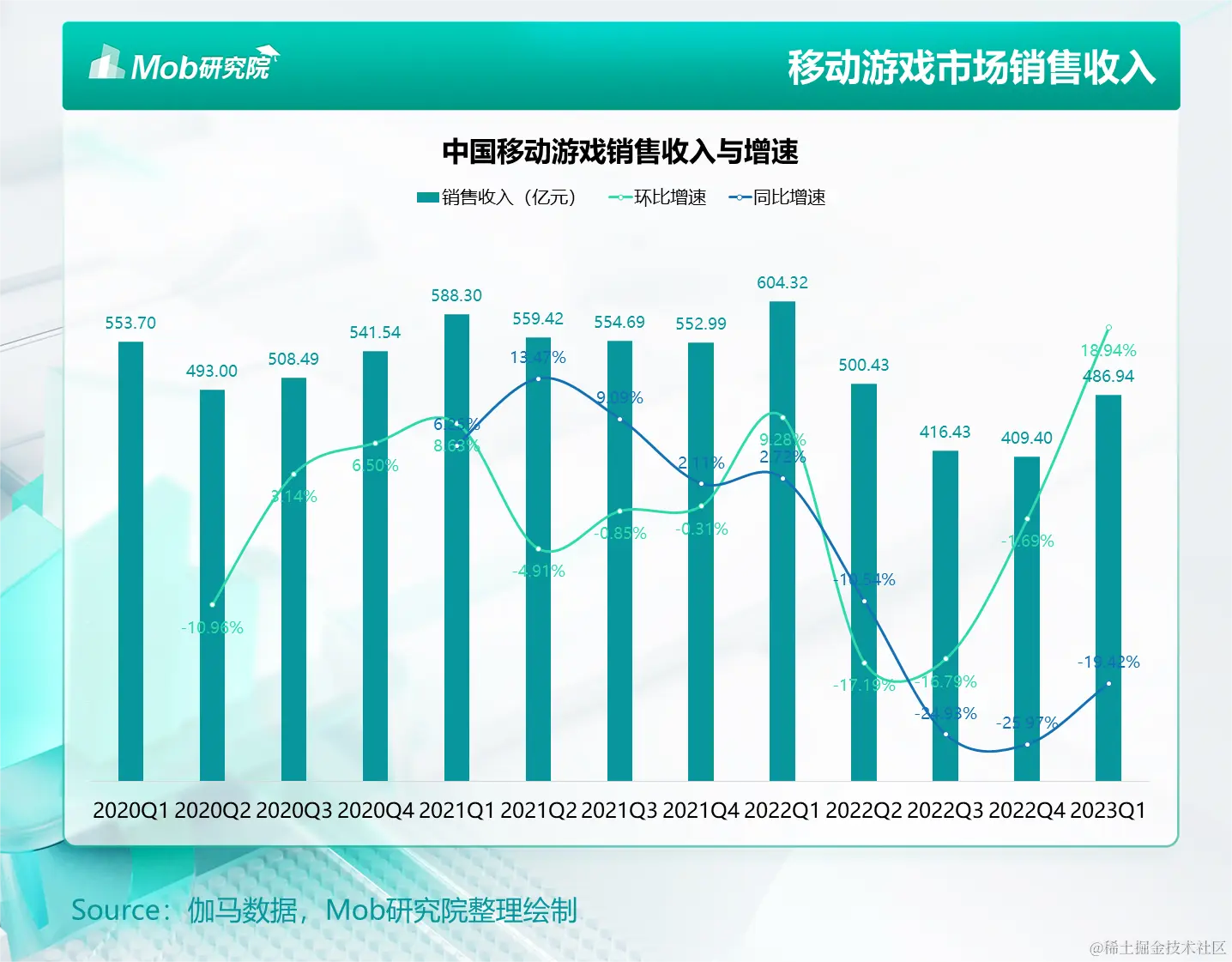 2023年Q1中国移动游戏市场整体表现不及预期,实际销售收入为486.94亿元,同比下降19.42%。虽整体有所下滑,但新鲜血液依然迸发强劲。