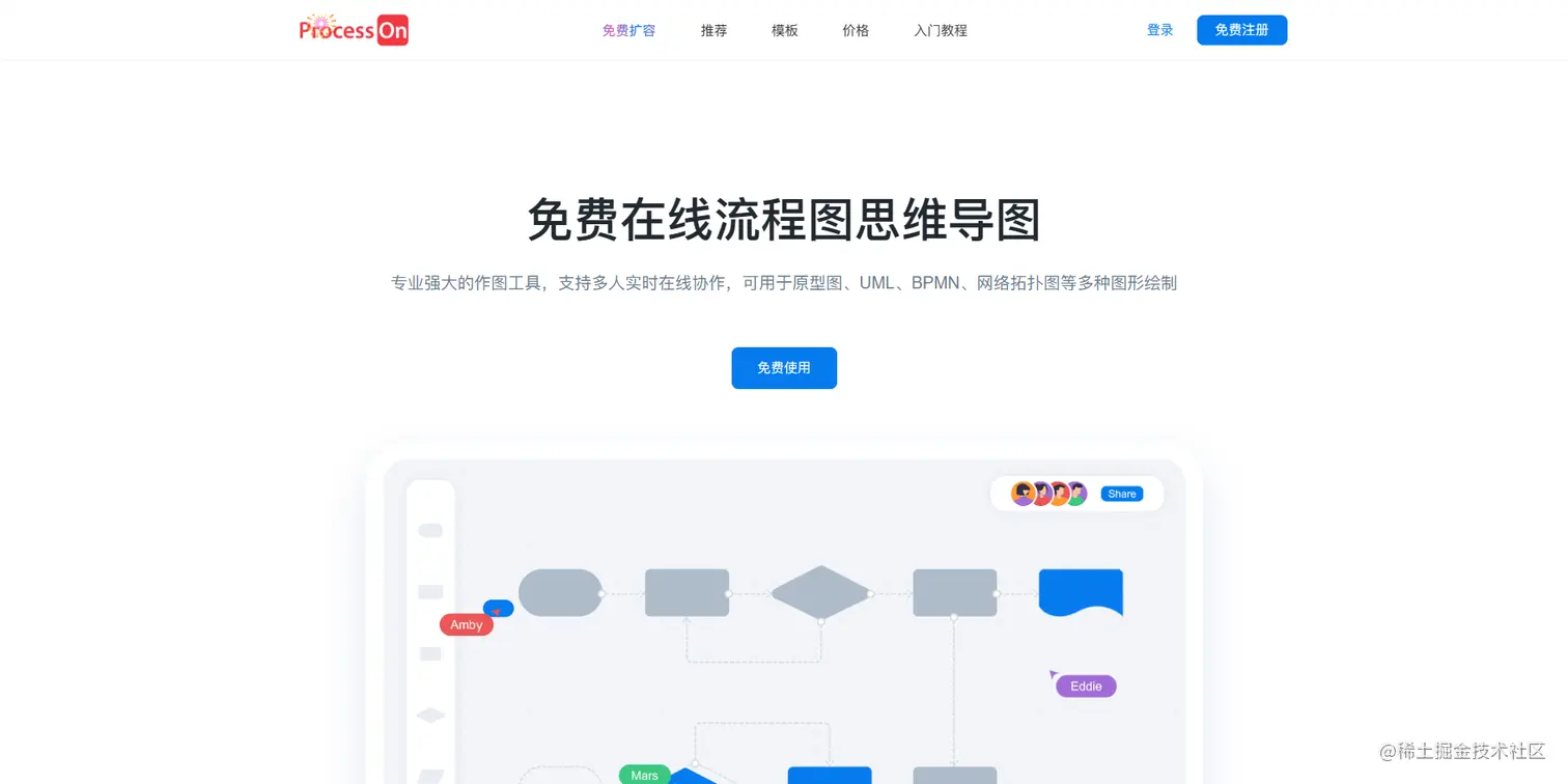 ProcessOn——在线作图工具的聚合平台,可制作思维导图、流程图、UML图、界面原型设计、组织结构图等等。免费、免安装,在线即可操作。