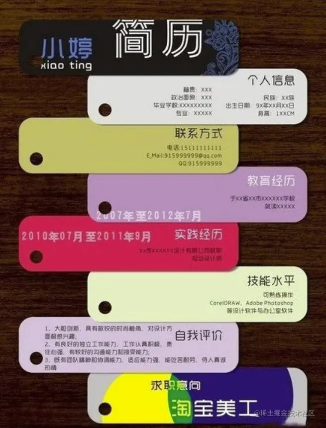 所以,为了让自己的简历看起来美观大方,从网上下载一些模板,也不管实不实用,反正五颜六色就对了……