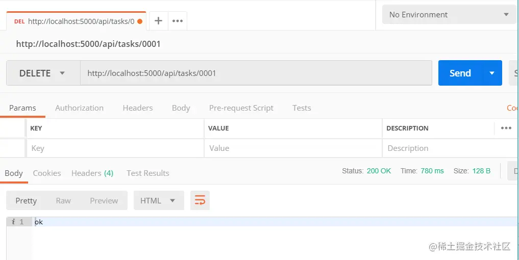 该接口的请求地址为/api/tasks/:taskId,请求方法为DELETE,如果删除成功则返回文本"ok"。